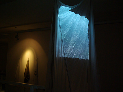 Double Vision is concerned with multiple perspectives: aerial perpectives in flight, maps, embodied human view points, and the places in which they meet and combine; map reading and in flight. A parachute hangs from the ceiling, becoming a screen for two video projections, one vertical the other horizontal. Standing on the balcony a viewer can gaze down at the slowly moving landscape, and glance up at the instrument panel above. The video on the floor was shot from a light aircraft with a static camera and shows a short flight from take off to landing. Its shape is a reference to the first drawing of the ground made by a person in flight in aeropaidia. The vertical projection at the top of the parachute is the view of a passenger, the framed shot moving as attention to the environment changes, and as navigation proceedures in a light aircraft are observed. These two views of the terrain form a double vision, that of an embodied viewer and of a fixed camera. Three silk maps (each approx. 100cm2) from the work Here hang beside the projections, the geometry of latitude and longitude folded as the silk hangs, further distorting easy readings of the landscape from above. The work is also concerned with a sense of (at least) double vision cultivated while working across the boundaries of art and sociology, in both material and discursive practices. Through this activity I attempt to engage with practice and production while also observing and analysing, processes that are not always easily differentiated. This goes beyond the performativity of research methods that ‘do not simply describe but in some measure help to do the realities that they discover’ (Law 2008: 640) into the creative production of artworks and therefore research situations. This work was produced at a similar time to writing this book chapter: