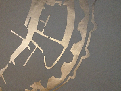 Walking to Work no.3 is a new iteration of this work made specifically for a conference about Networked Urban Mobilities. Over the past 7 years I have been working with the Centre for Mobilities Research at Lancaster University where I am now creative director. I have been contributing to a move in this area to include exhibitions as central elements of research events. This exhibition surrounded the social spaces of the conference and included work by Allan Sekula & Noel Burch, Michael Hieslmair & Michael Zinganel, Rhei, Lee Lee and Antonia Hernandez. Most of the artists in the exhibition also gave papers or participated in panel discussions. The live data from conference delegates and local participants was projected onto a map of the water in Copenhagen made with silver leaf. Through the app, participants could see each other converging on the conference, and see their comments updated as they participated in discussion through the app. The map was then annotated and traced by anyone at the conference to produce a longer lasting trace of activity. The map is only of water in the landscape in order to offer a recognisable geographical anchor for the projection, and yet to be obviously a partial map that does not reveal detail of participants locations, or anticipate roads, railways and footpaths. The projected data can therefore be viewed in terms of how the locations of participants relate to each other in terms of proximity, trajectory, and speed rather than by precisely where each individual is located. The map is drawn in silver ink, as the viewer moves in relation to the drawing its visual appearance changes, reflecting more or less light depending on the position of the viewer. A map that changes in relation to the viewer suggests that instead of the 'God's eye view' usually associated with aerial perspectives, that the map is always a fragment showing a specific political or social perspective on landscape, and viewed in different ways depending on the map readers situation. The live mapping offers participants with a shared experience of 'comobility', of being mobile with othes at a distance. As smart phones allow GPS to be a networked technology this form of mobile communication becomes possible, and through 'Walking to Work' participants reflect on what it means to them to be connected at a distance through their movements, location, speed, trajectory and mode of travel which can all be read in the subtle movements of the blue dot on the screen. |